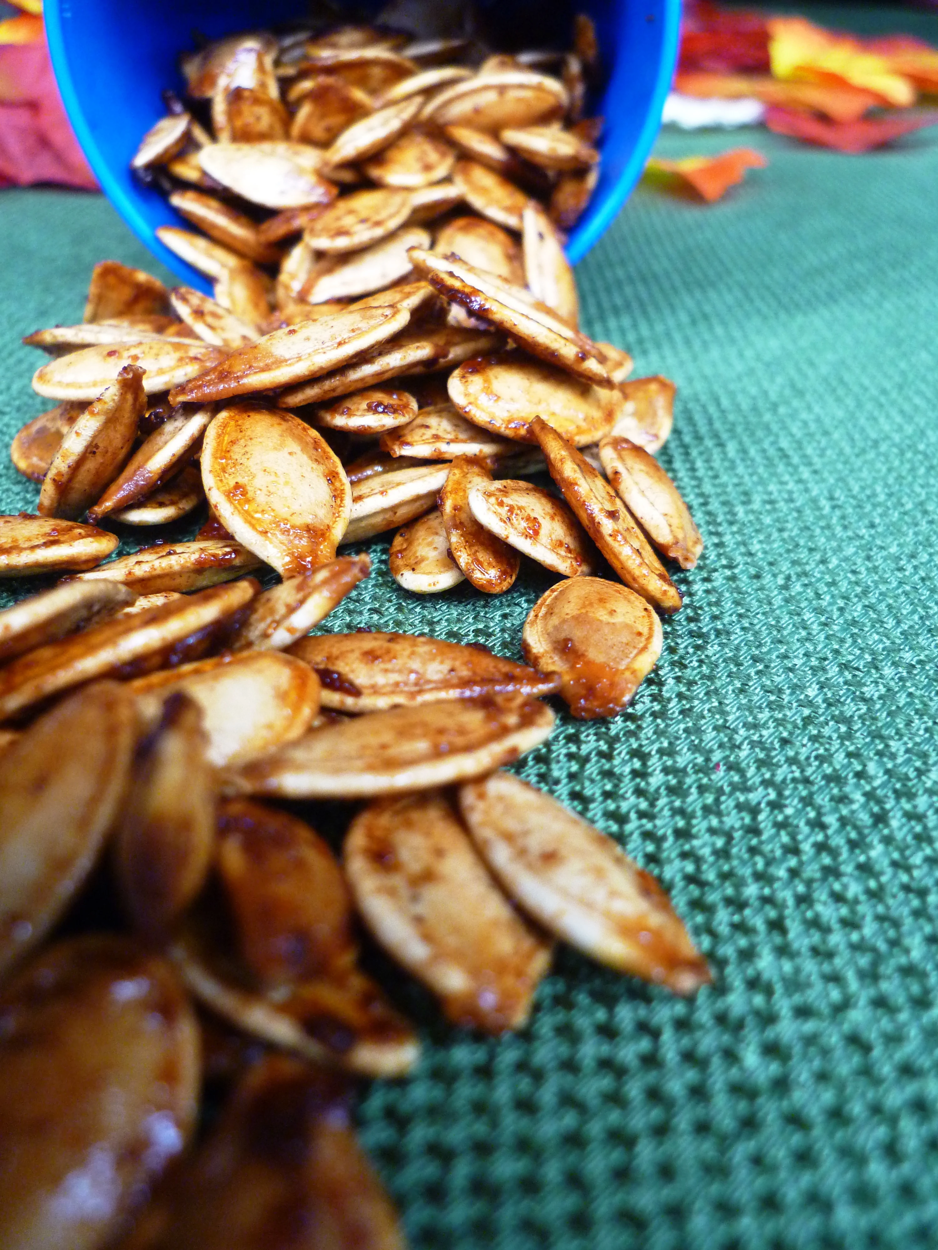 Roasted Pumpkin Seeds Recipe #2 (sweet) 1 c. pumpkin seeds, rinsed thoroughly 1 T. oil ½ t. brown sugar ¼ - ½ t. cinnamon 1/8 t. salt Mix all ingredients together, making sure the seeds are thoroughly coated. Place seeds in a single layer on a cookie sheet and bake at 280 for 45-50 minutes (or until browned and toasty looking), stirring every 15 minutes. Let cool and store in an air-tight container. …goofed up the oven settings and this batch overcooked. Still pretty good, though!